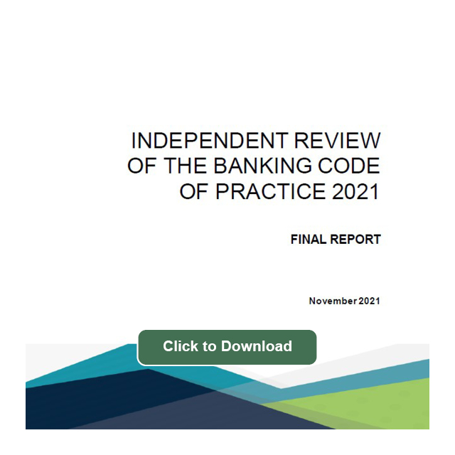 The Code is independently reviewed every three years. The 2021 independent review is being undertaken by Mr Mike Callaghan AM PSM. The review is being undertaken in consultation with consumer representatives, small business organisations and other stakeholders. The Terms of Reference outline the scope of the review. A Consultation Note outlining some of the issues that will be covered in the review and interested parties are invited to comment on these issues or any other matter they consider relevant to the review. The FINAL REPORT of the review was reported end of November 2021.